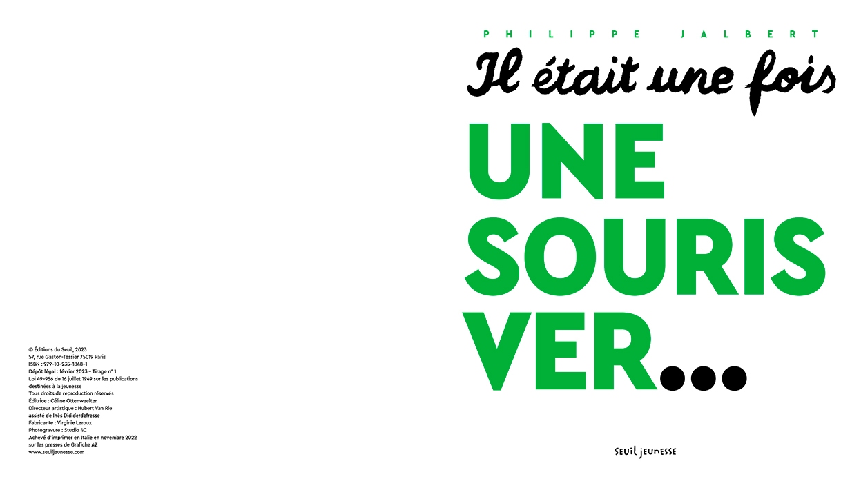 Il était une fois une souris ver…a paru aux éditions du Seuil jeunesse. Il est disponible dans toutes les librairies et sans doute à côté de chez vous (trouvez la librairie la plus proche de chez vous ayant le livre en cliquant ici). Si vous ne pouvez pas vous déplacer, vous pouvez le commander et vous le faire expédier gratuitement par n’importe quel libraire. Sinon vous pouvez toujours le commander chez Cultura, Fnac ou chez l’ogre Amazon