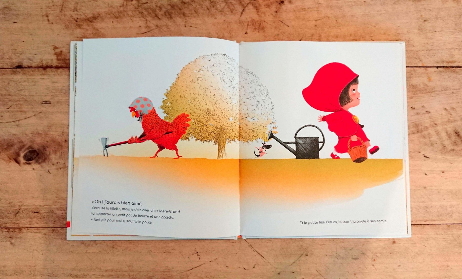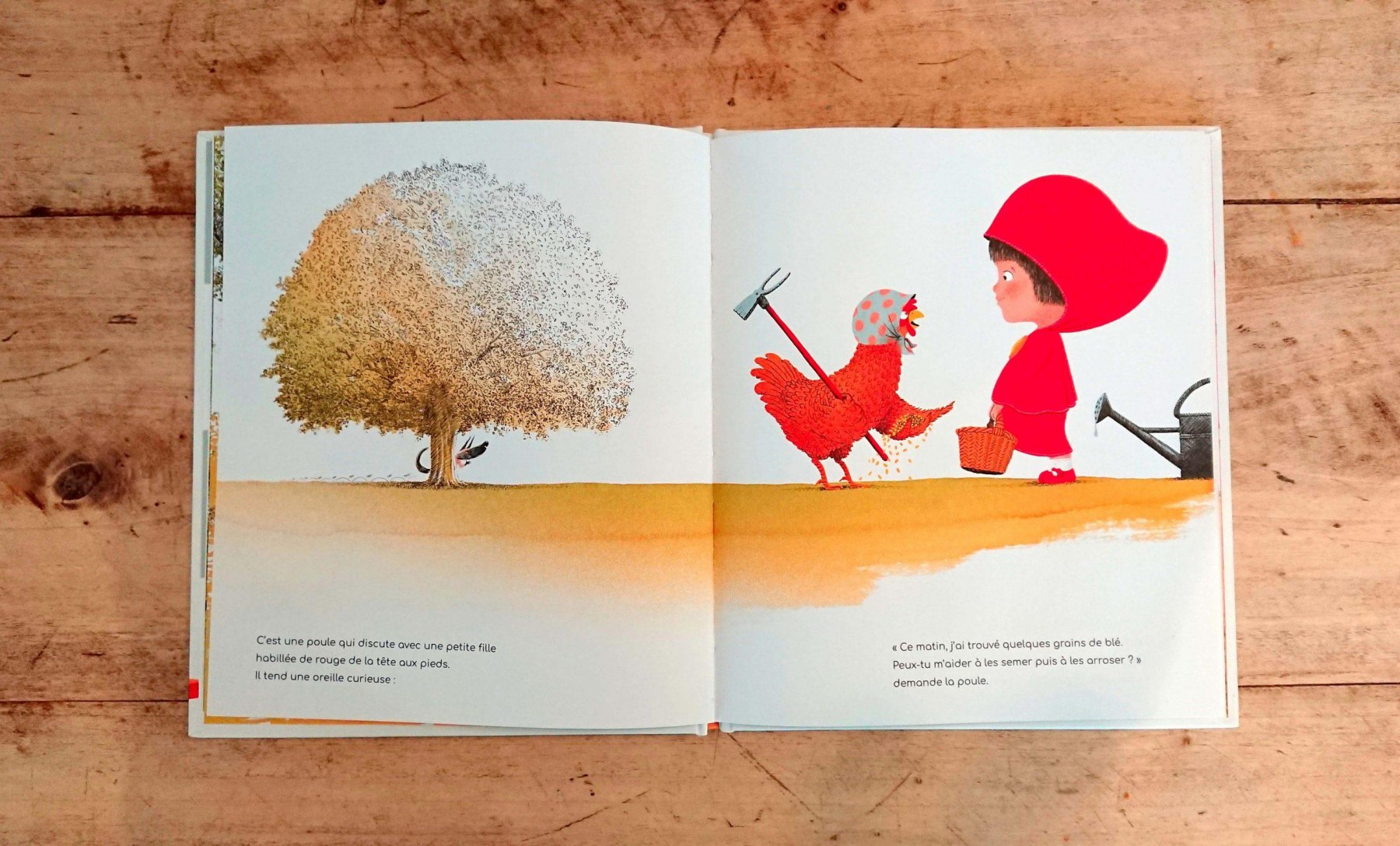 Qui pour aider Petite Poule rousse à cultiver son blé ? Le Petit Chaperon rouge, les 3 Petits Cochons et les 7 chevreaux ont d’autres occupations bien plus intéressantes. Mais pendant que la Petite Poule cherche de l’aide, le loup ne perd pas une miette du spectacle jusqu’au moment où il se décide à proposer son aide… ou presque.