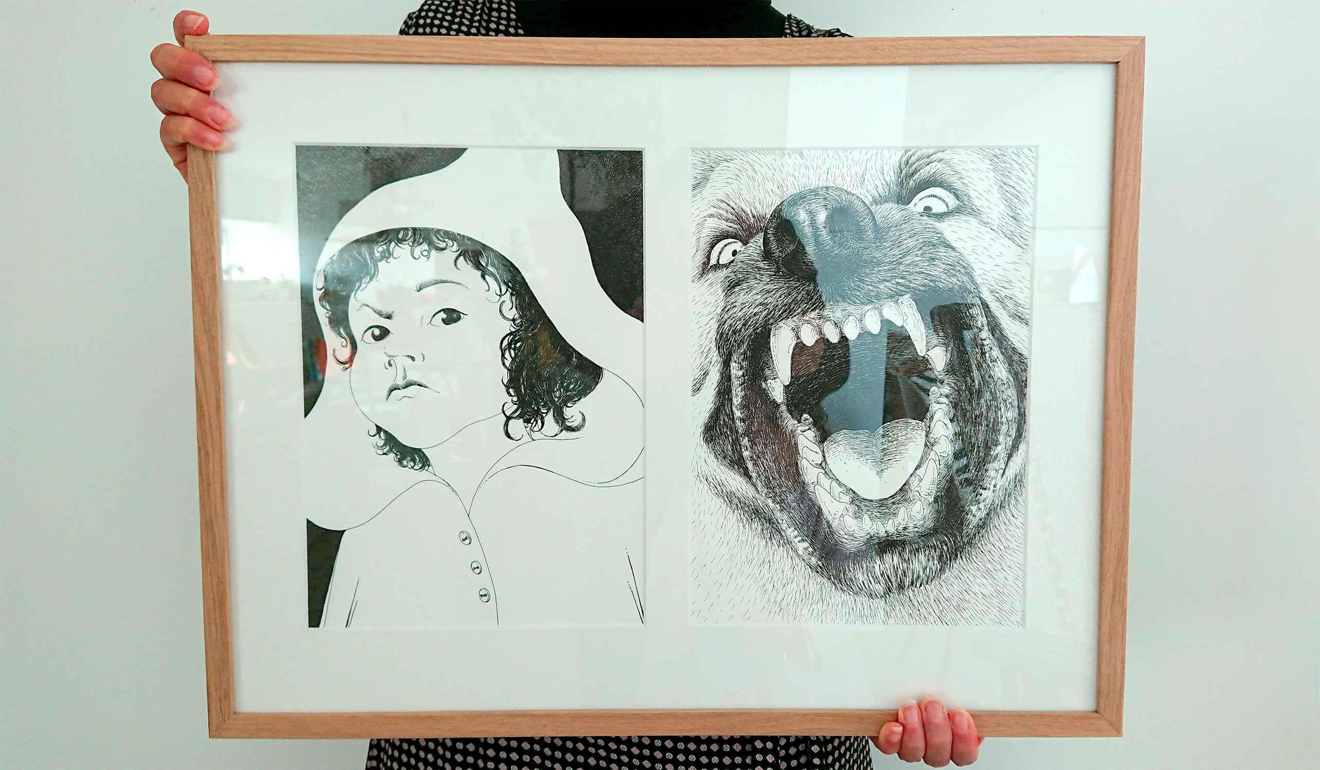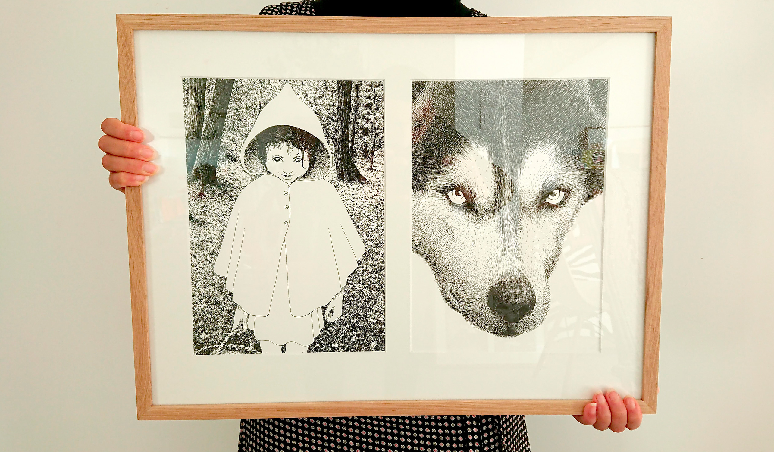 Quelques photos des illustrations originales encadrées issues de l’exposition LE PETIT CHAPERON ROUGE en location :