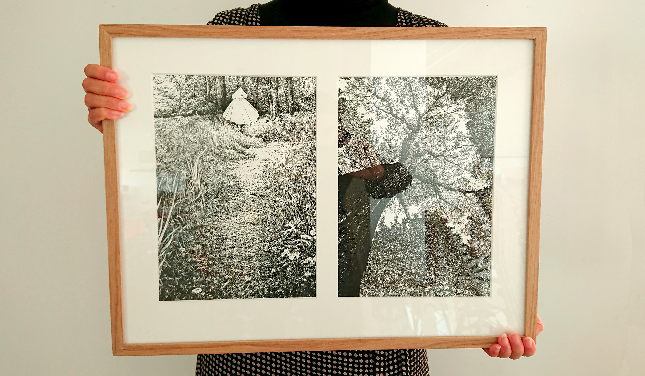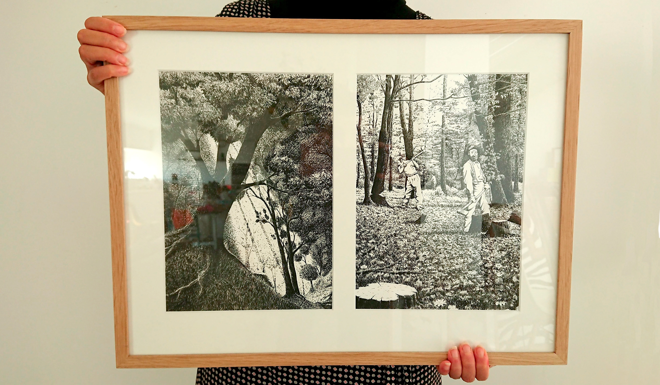 - 10 cadres en chêne clair brut contenant chacun deux illustrations en vis à vis (format 56 x 42 cm ) avec crochet