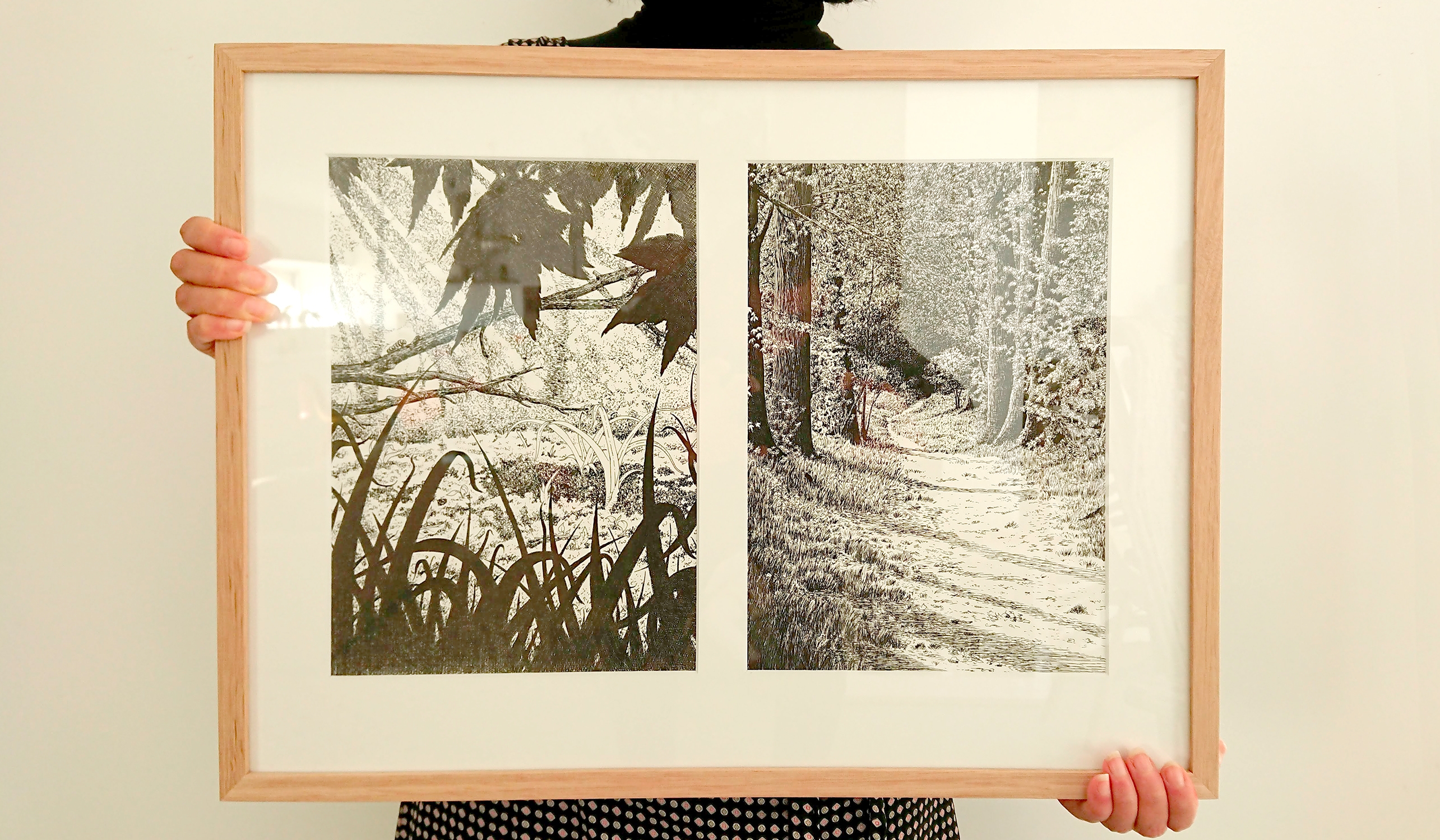 - 2 cadres en chêne clair brut contenant chacun une illustration en gravure ( format 18 x 25 cm ) avec crochet