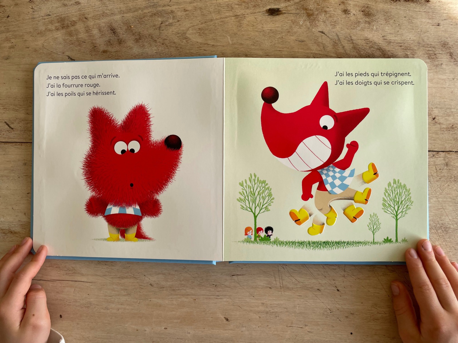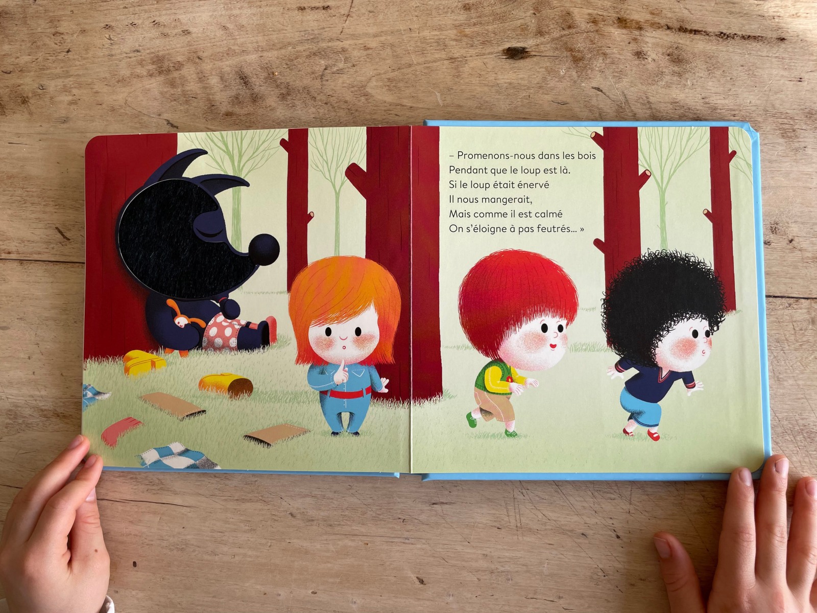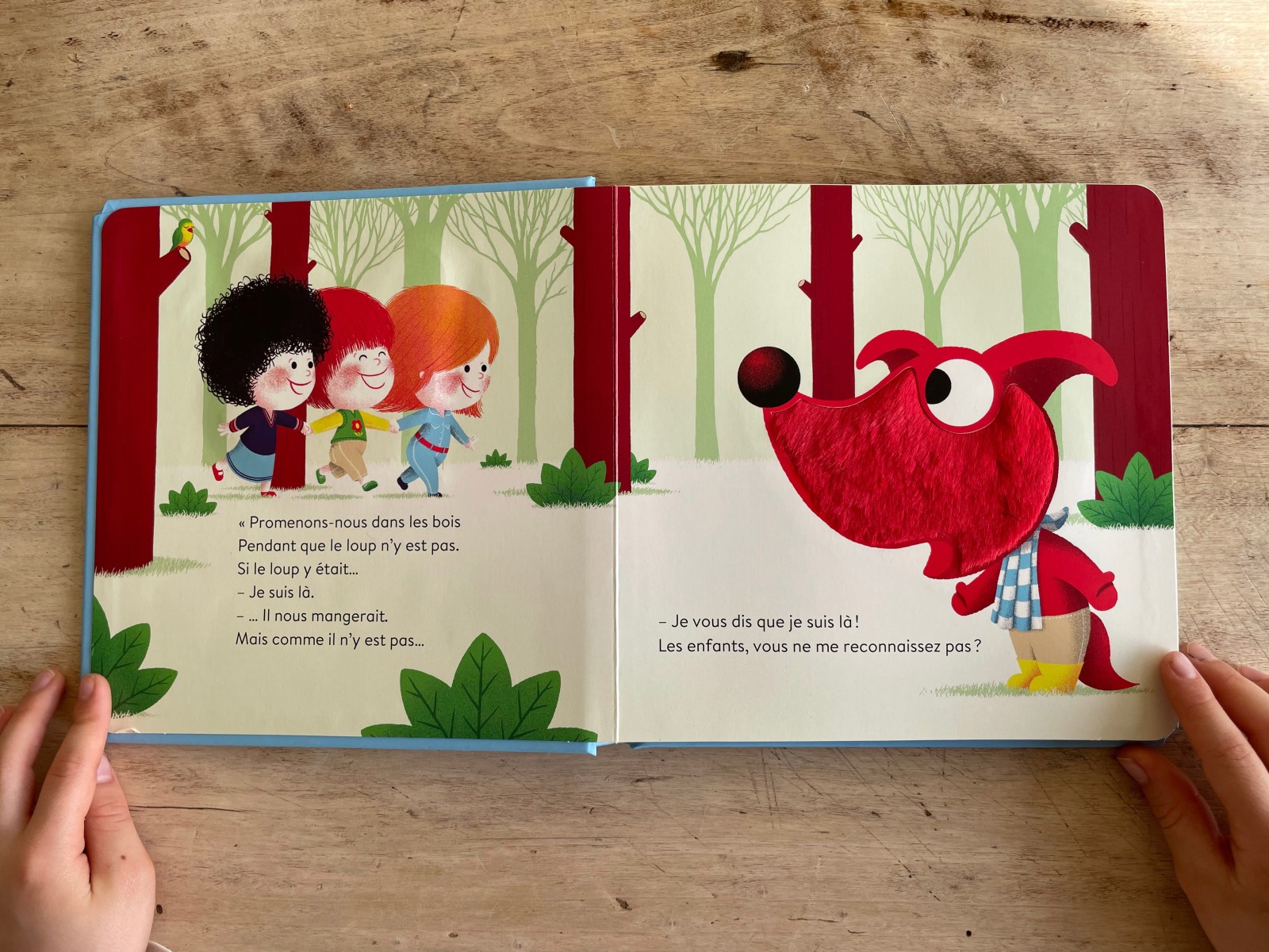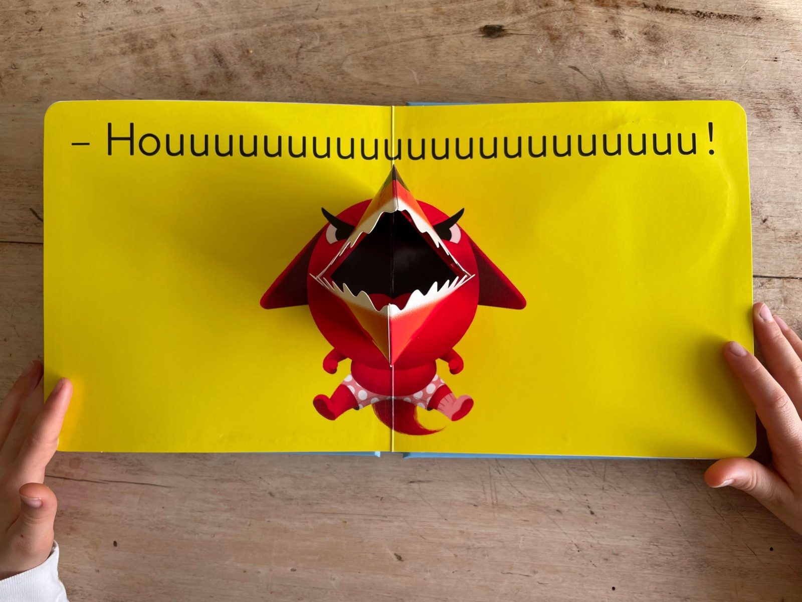 Comme dans les livres précédents, l’enfant pourra toucher différentes matières venant renforcer l’histoire et un pop-up de la gueule du loup surgit pour accentuer la chute de l’histoire.