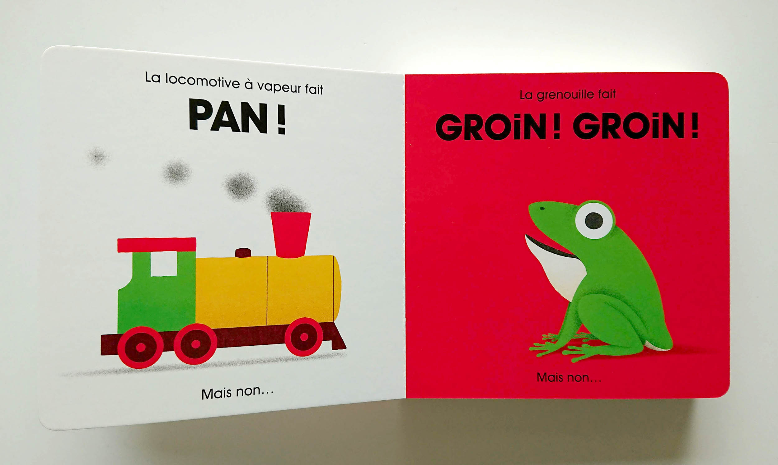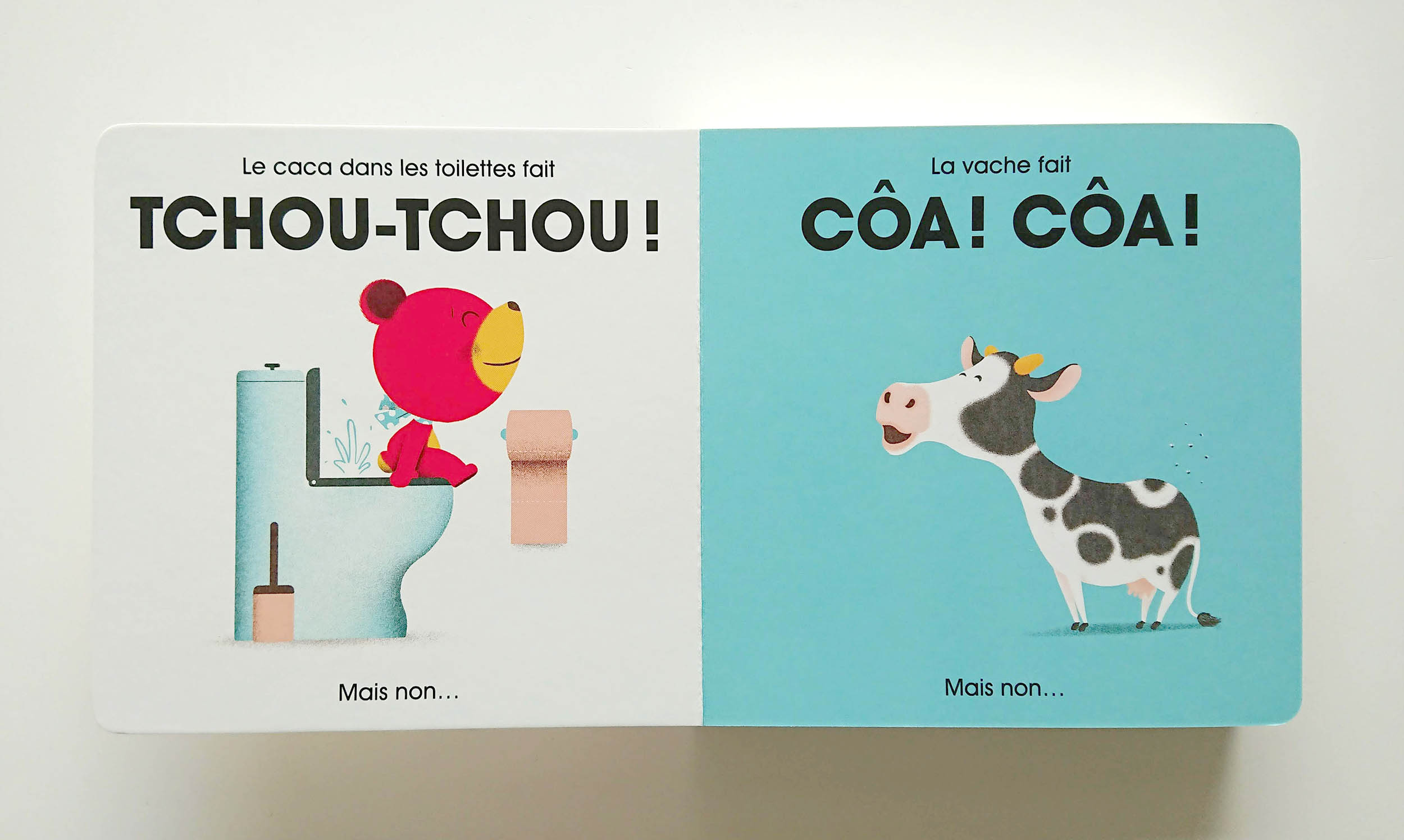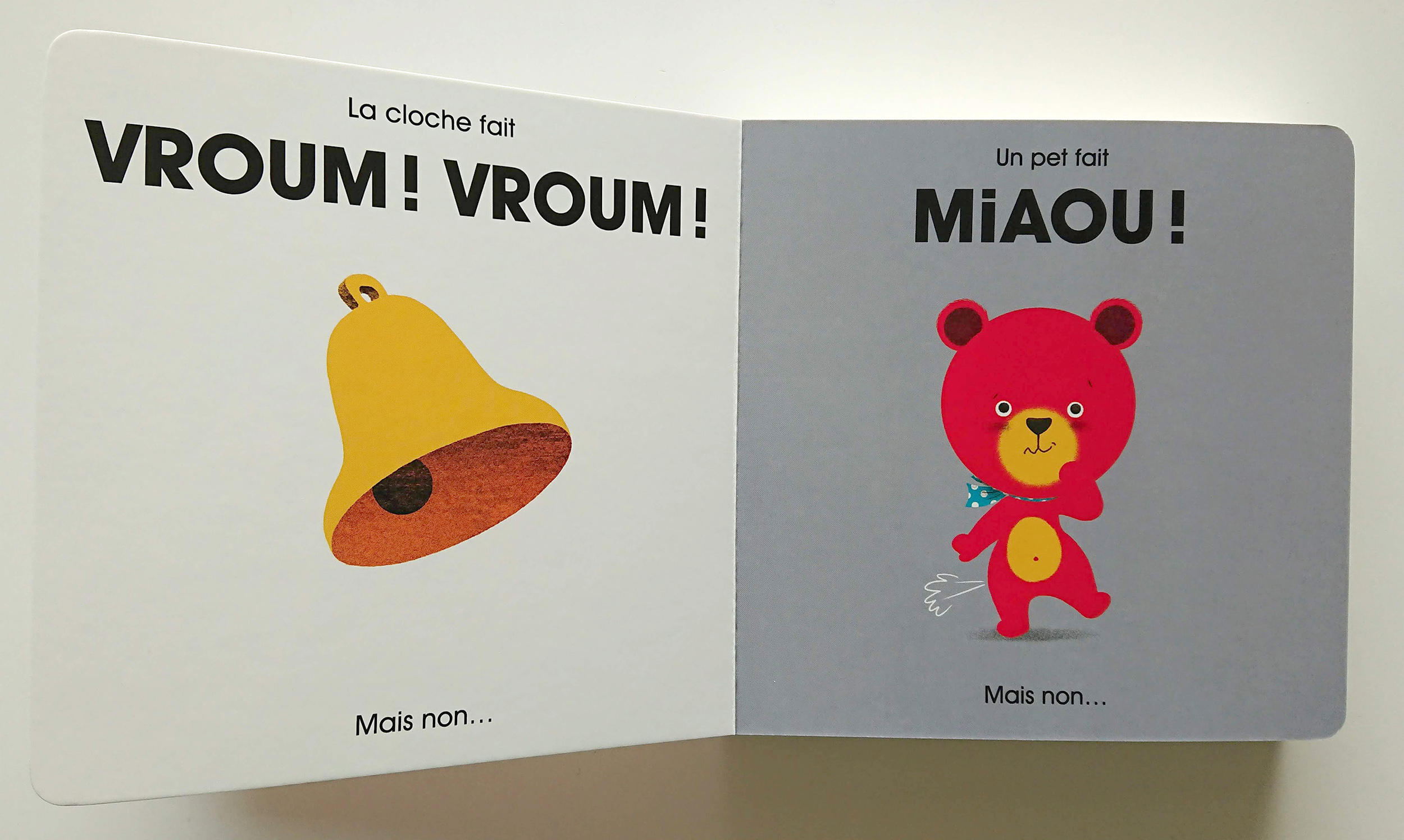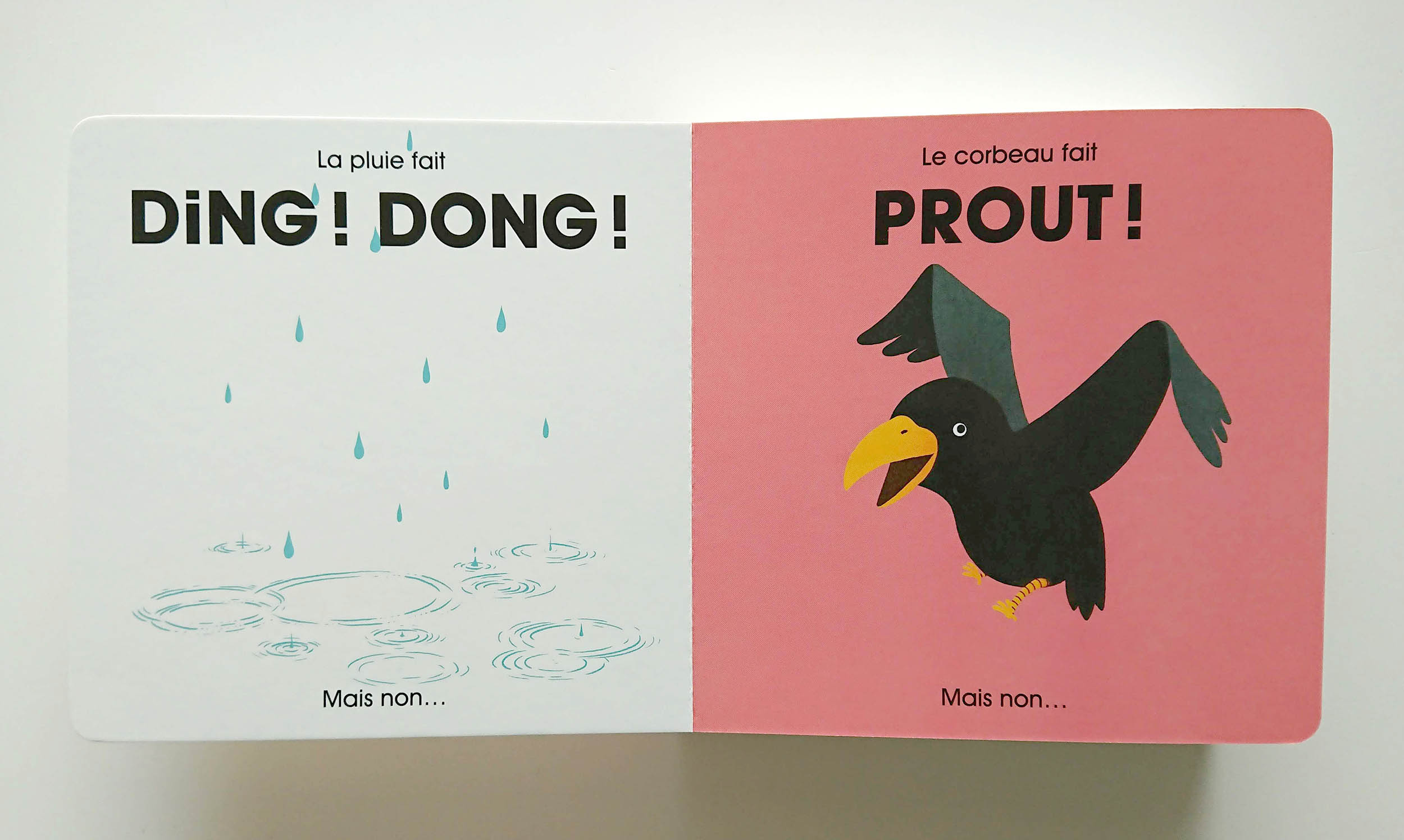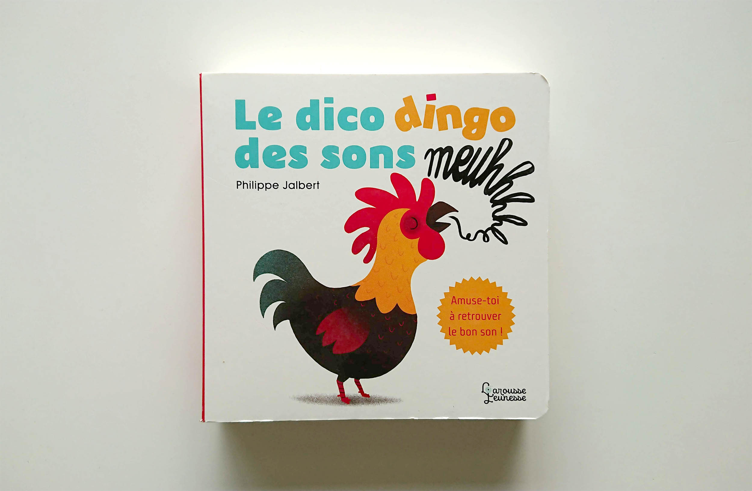 Le dico dingo des sons est un imagier où toutes les sons ont été décalé d’une page. Ainsi l’avion fait PLIC PLOC ! Quand on boit ça fait CRÔA CRÔA ! La pluie fait DING DONG ! Le corbeau fait PROUT ! La cloche fait VROUM VROUM ! Un pet fait MIAOU !