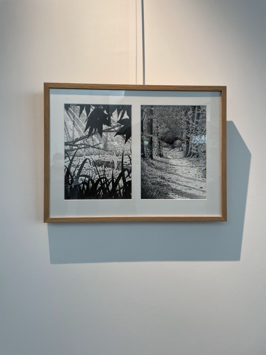 - 2 cadres en chêne clair brut contenant chacun une illustration en gravure ( format 18 x 25 cm ) avec crochet