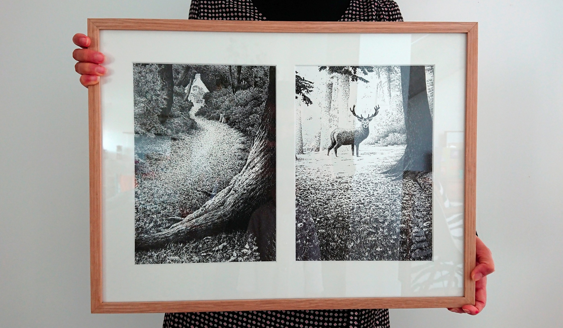 - 10 cadres en chêne clair brut contenant chacun deux illustrations en vis à vis (format 56 x 42 cm ) avec crochet